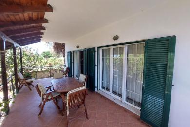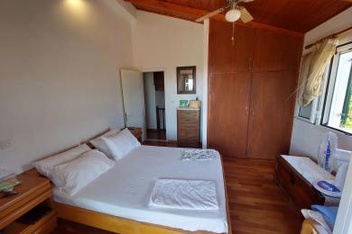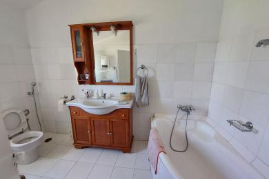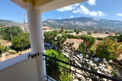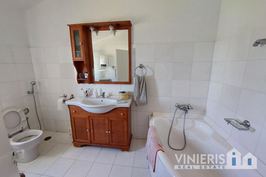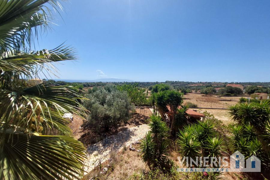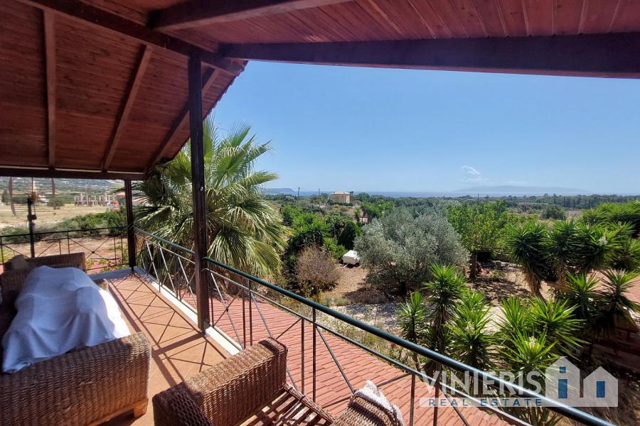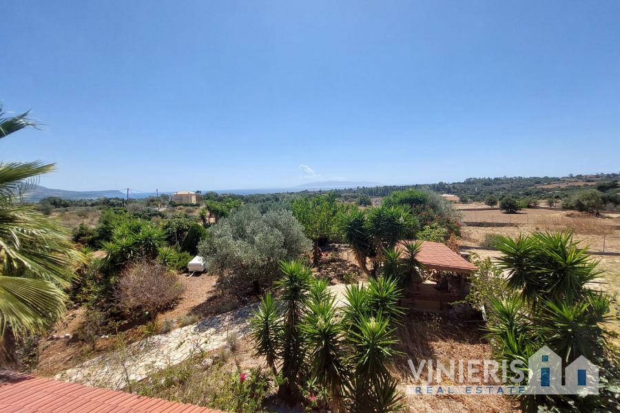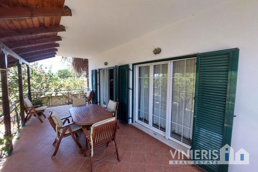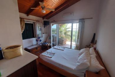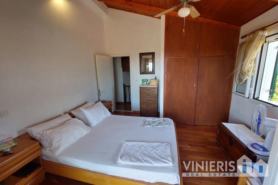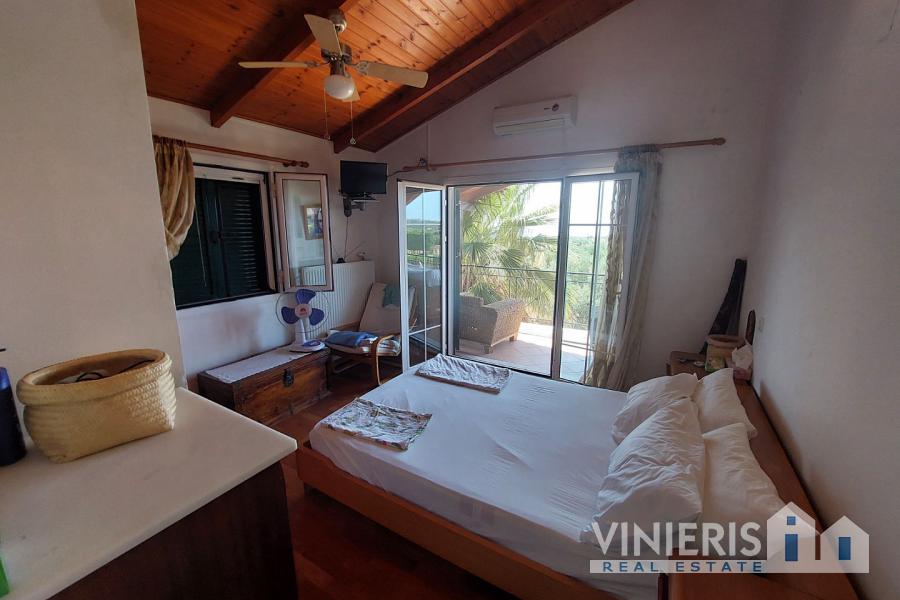Upstairs, there are two bedrooms with access to a balcony boasting panoramic views of the fertile valley and the Ionian Sea. A second bathroom on this floor ensures both comfort and practicality.