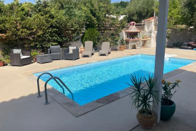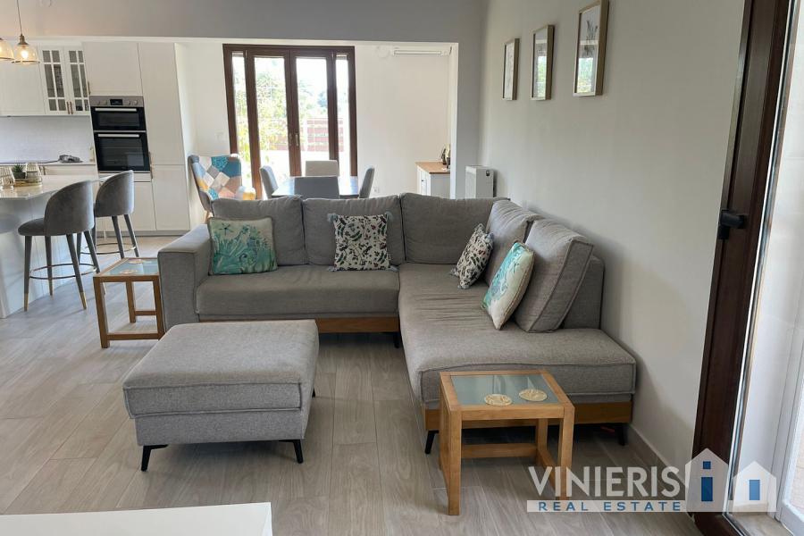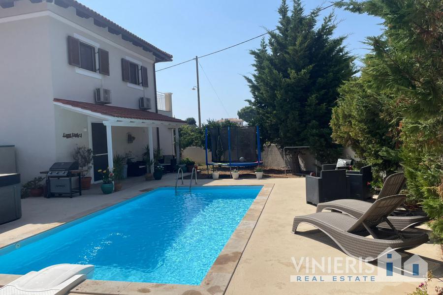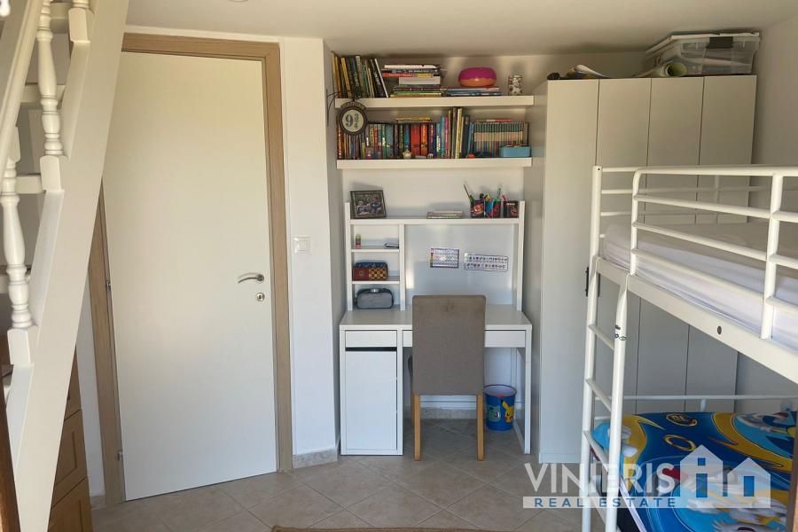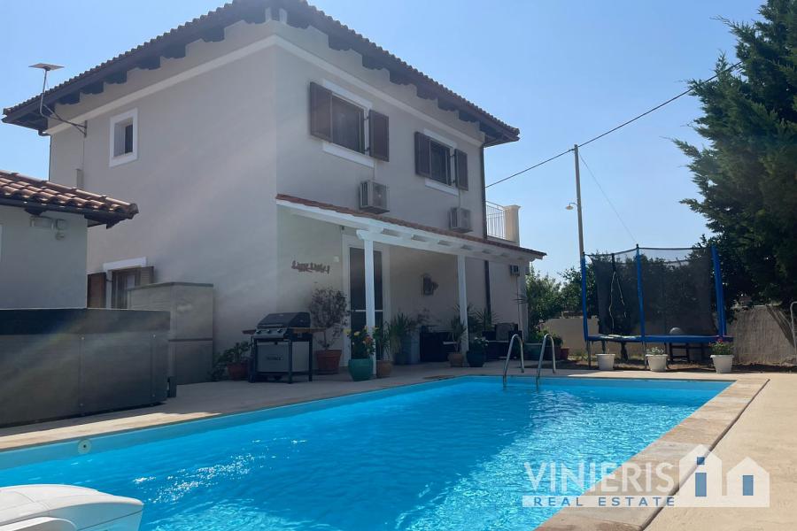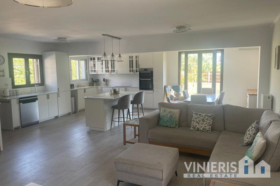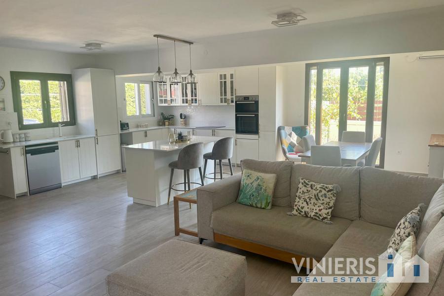 Set on a 710sqm plot, the 132sqm villa features a fully renovated (2024) open-plan kitchen, dining, and living area that flows seamlessly onto a covered veranda overlooking the lush garden and a 7x3.5m pool, perfect for relaxing or entertaining on warm summer days. There is also a guest bathroom and a 10sqm storeroom.