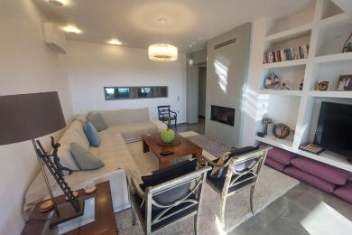 The interior of the villa features a spacious, functional layout with abundant natural light. The bright living room, equipped with an energy-efficient fireplace, offers direct access to a terrace with stunning views of the endless blue horizon. The modern, fully equipped kitchen provides ample storage and contemporary amenities, perfect for daily living.