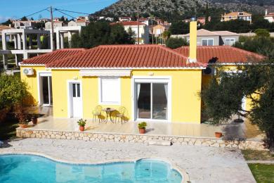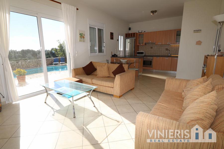Η κατοικία εκτείνεται σε ένα επίπεδο και διαθέτει θέα προς τη θάλασσα, συνδυάζοντας άνεση, λειτουργικότητα και χαλάρωση. Έχει συνολική επιφάνεια 110 τ.μ. και είναι χτισμένη σε οικόπεδο 500 τ.μ., με έναν περιποιημένο κήπο με γκαζόν και ιδιωτική πισίνα, δημιουργώντας ένα ιδανικό περιβάλλον καλοκαιρινής απόλαυσης.