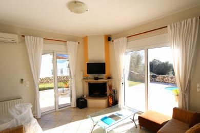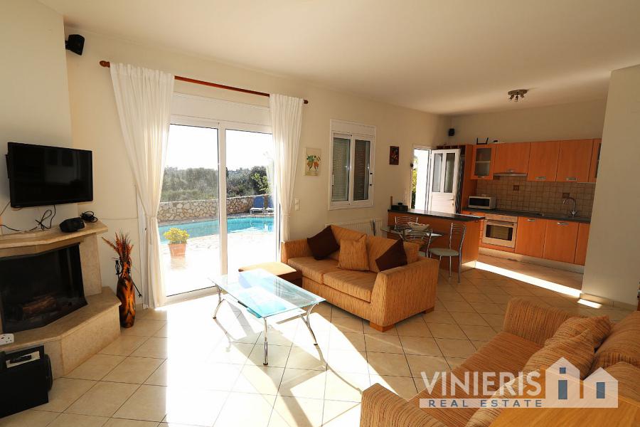 Στο εσωτερικό, η είσοδος οδηγεί σε έναν ενιαίο, ευρύχωρο και φωτεινό χώρο που περιλαμβάνει άνετο σαλόνι με τζάκι, ιδιαίτερα φιλόξενο, καθώς και πλήρως λειτουργική κουζίνα στον ίδιο χώρο. Το ακίνητο διαθέτει κεντρική θέρμανση, εξασφαλίζοντας άνεση και τους χειμερινούς μήνες.