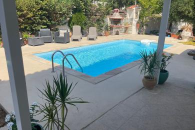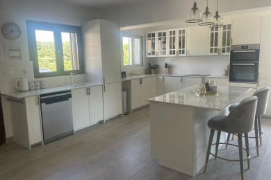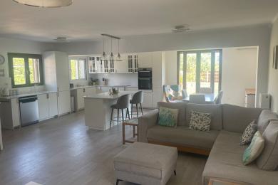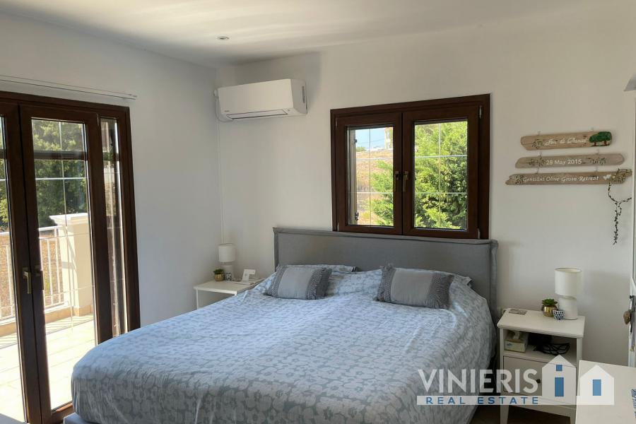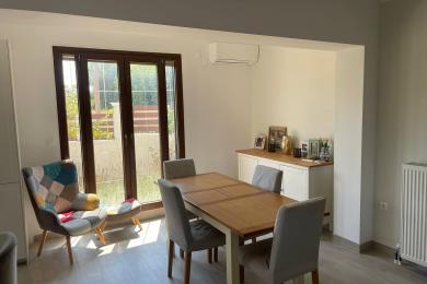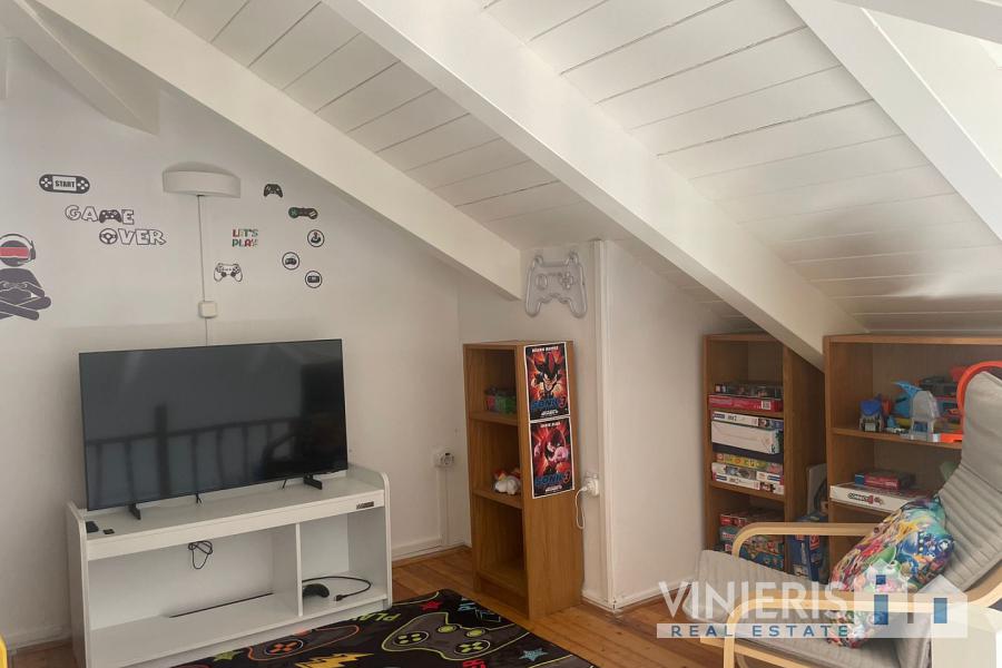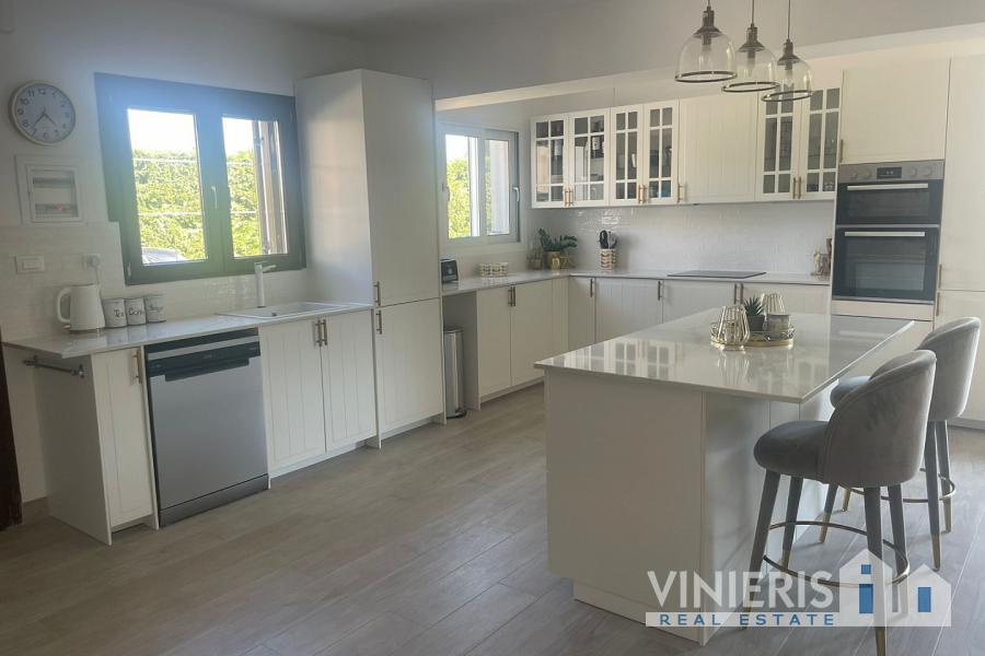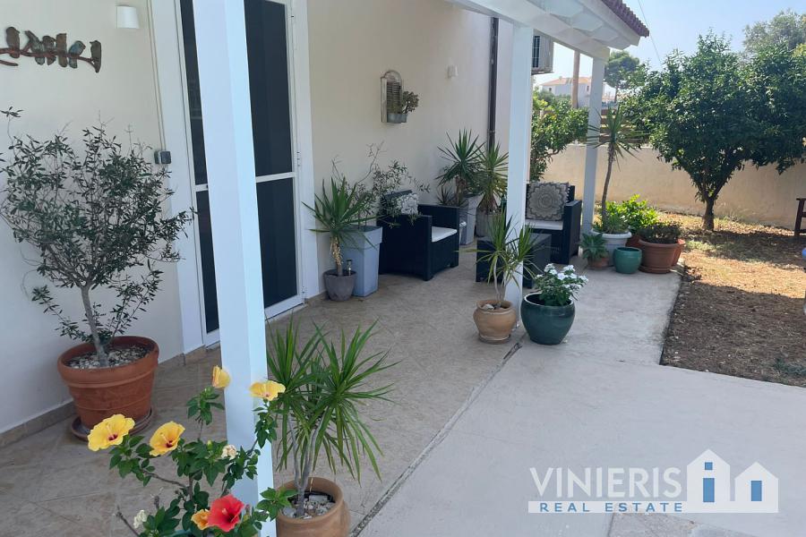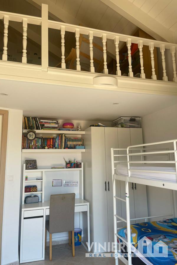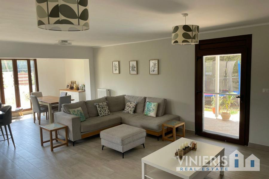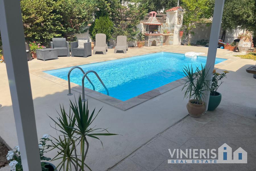 Set on a 710sqm plot, the 132sqm villa features a fully renovated (2024) open-plan kitchen, dining, and living area that flows seamlessly onto a covered veranda overlooking the lush garden and a 7x3.5m pool, perfect for relaxing or entertaining on warm summer days. There is also a guest bathroom and a 10sqm storeroom.