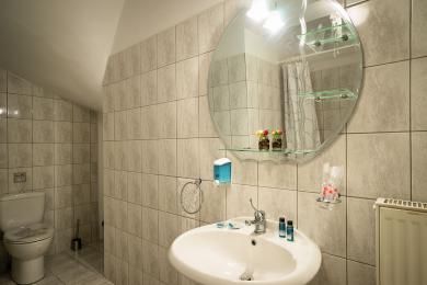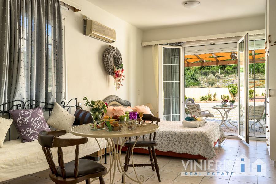 The second level radiates sophistication and elegance. It features a spacious living room with large windows that flood the space with light, a stylish dining area, and a modern kitchen with a sitting area where you can enjoy your breakfast. There is also a bright bedroom with balconies and terraces offering incredible views of Argostoli, Lixouri, and the surrounding mountains. On this level, you will also find an independent studio with its own bathroom, kitchen, and storage space, which has a separate entrance and can function autonomously or be connected to the rest of the house.