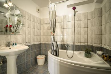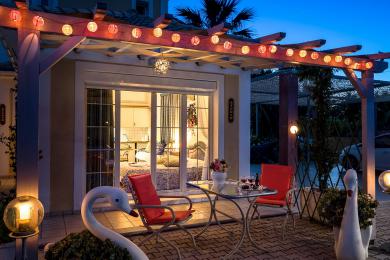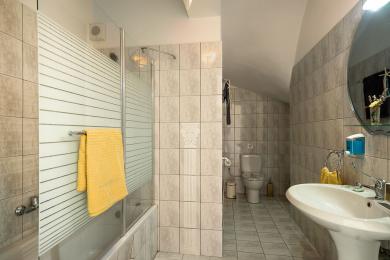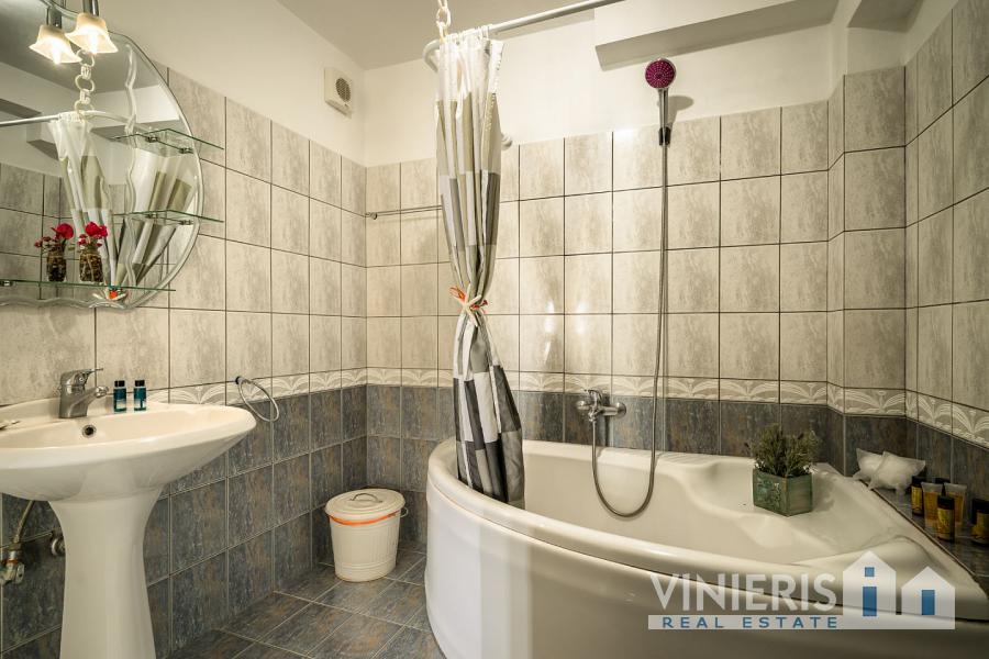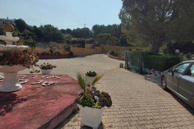 The exterior of the villa is a true masterpiece. The spacious gardens are beautifully landscaped, with blooming ornamental plants, fruit trees, olive trees, and palm trees, among which two impressive 35-year-old palm trees stand out. In the yard, you will find flower beds, cobblestone pathways, and a polygonal base ready for fountain installation. There is a large concrete rainwater tank with a capacity of 120 cubic meters and full infrastructure for drainage systems and a septic tank.